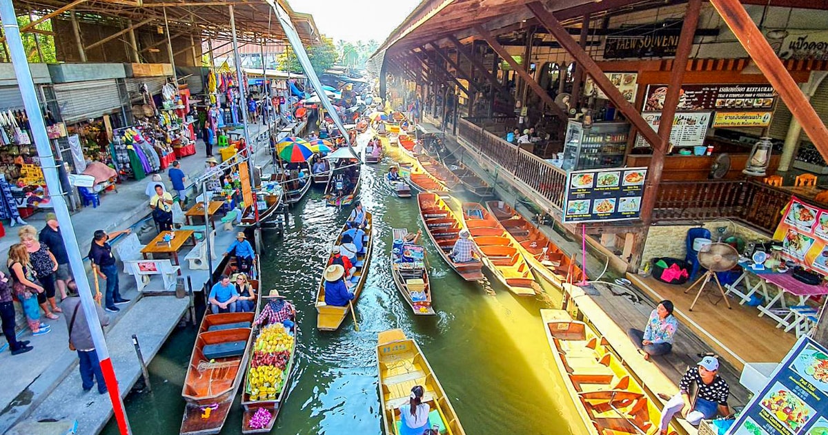 أشهر تجربة تسوق في تايلاند حيث تتجول بين القوارب لشراء الفواكه والمنتجات المحلية.