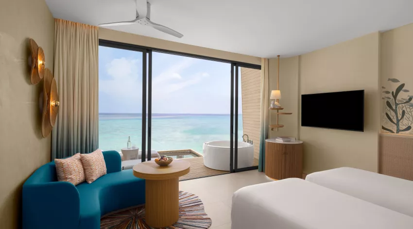 استمتع برفاهية الجزيرة في فيلتنا فوق الماء المجهزة بجاكوزي، ملاذٌ بمساحة 54 مترًا مربعًا. استمتع بشرفة خاصة مع دش خارجي وأرجوحة استرخاء، وإطلالات خلابة على المياه المتلألئة.